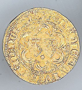 Keerzijde: tronende vorst onder gotisch baldakijn, middenonder een schild met een klimmende leeuw. Voorstelling oversnijdt aan boven- en onderzijde een parelrand. Met omschrift.