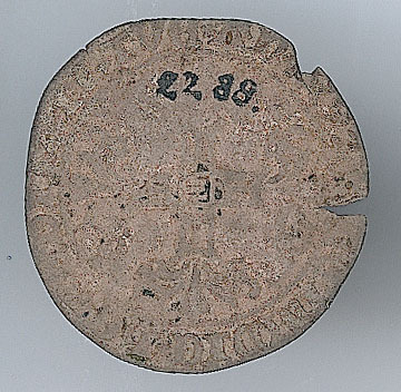 - BeschrijvingVoorzijde: binnen een parelrand het wapen van Philips de Schone overeind gehouden door een leeuw, met een omschrift. Keerzijde: binnen een parelrand een gebloemd kruis met het wapen van Mechelen in het hart, met een omschrift.