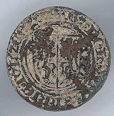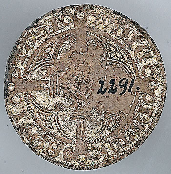 Keerzijde: een lang kruis met geschulpte uiteinden dat een parelrand doorsnijdt. In het hart van het kruis een fleur-de-lis. Binnen de parelrand een vierpas met driebladige bloemen in de zwikken en een omschrift.