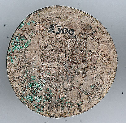 Keerzijde: een stammenkruis beladen met het gekroonde Spaans-Oostenrijks-Bourgondische wapen, waaronder het Gulden Vlies hangt. Het wapen is geflankeerd door twee vuurstalen, met een omschrift.