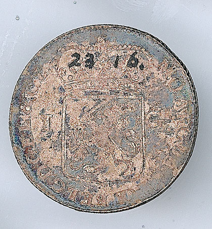 Keerzijde: het gekroonde statenwapen, geflankeerd door de waarde-aanduiding 1-G. Met een omschrift en een parelrand.