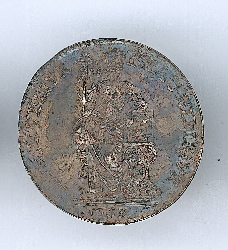 Voorzijde: Nederlandse maagd, staand, met de linkerarm leunend op een bijbel die op een zuil is geplaatst, in haar rechterhand een lans met de vrijheidshoed. Onder de maagd het jaartal 1763. Met omschrift.