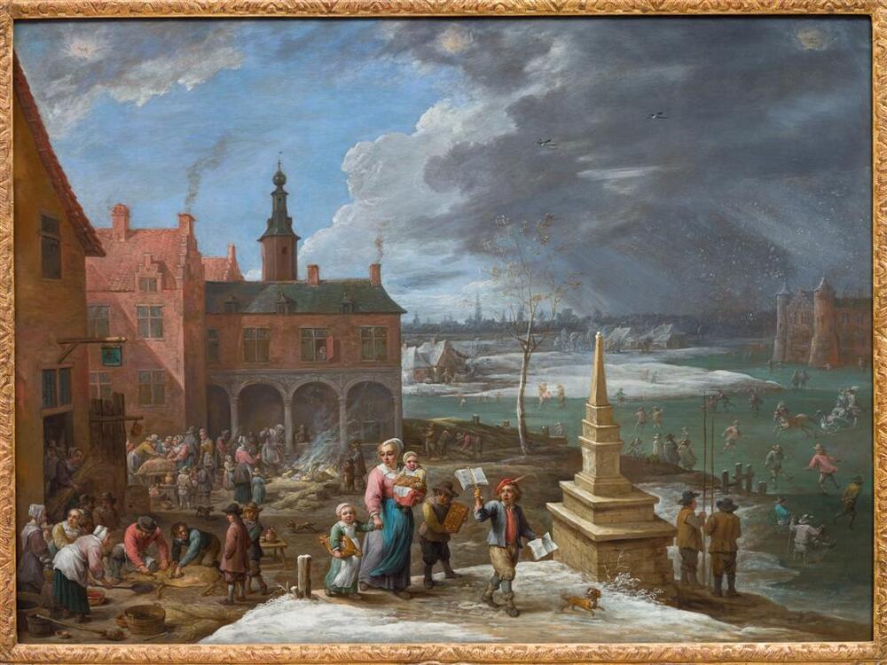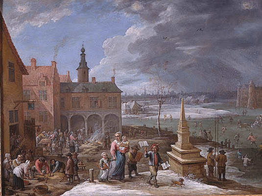 Vierde schilderij uit de serie de vier jaargetijden. De winter wordt aangeduid met de sterrenbeelden Steenbok, Waterman en Vissen en door de activiteiten kenmerkend voor het seizoen: het slachten der varkens (december/wintermaand), ijspret (januari/louwmaand).