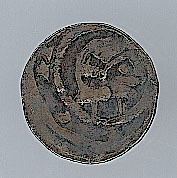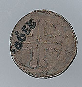 - BeschrijvingVoorzijde: binnen een parelrand een kop 'en profil' naar rechts, met onleesbaar omschrift. Keerzijde: binnen een parelrand een kort dubbellijnig kruis met een stip in één van de kwartieren, met onleesbaar omschrift.