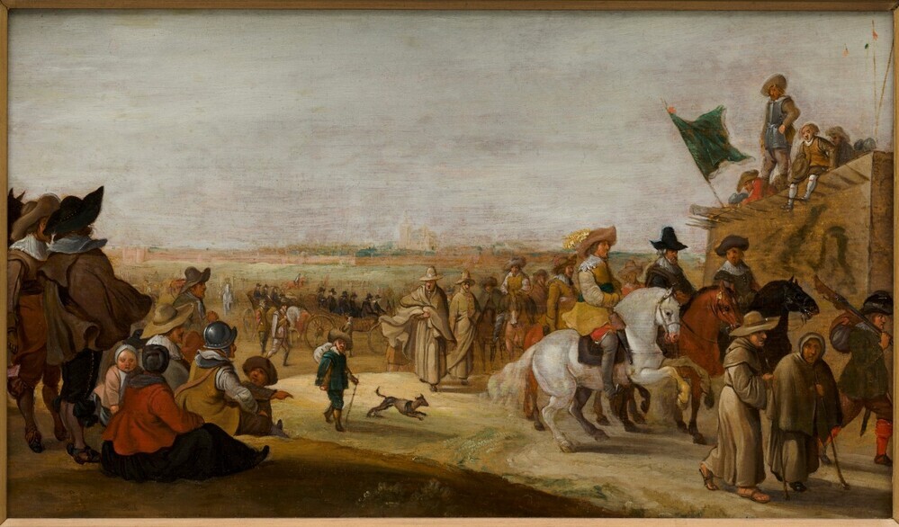 De legeraanvoerders van de twee strijdende partijen tijdens het beleg van 's-Hertogenbosch in 1629 nemen op een waardige manier afscheid van elkaar. Toen Grobbendonck de stad verliet stond de prins boven op een der batterijen. Zij brachten elkaar de soldatengroet.