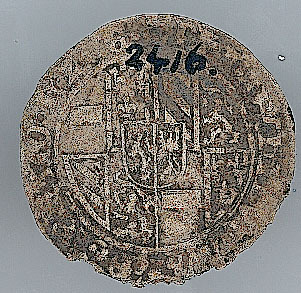 Voorzijde: binnen een parelrand een gebloemd kruis met een bloem in het opengewerkte hart. In de kwartieren twee leeuwen en twee kronen, paarsgewijze tegenover elkaar.
