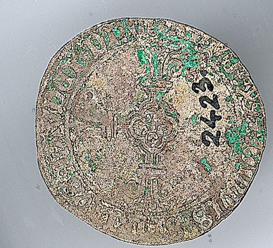 Keerzijde: binnen een parelrand een gebloemd kruis met een bloem in het opengewerkte hart, met een omschrift.
