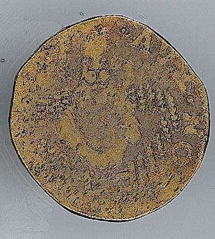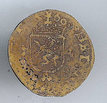 - BeschrijvingVoorzijde: zittende vrouw in een Hollandse tuin, met een omschrift. Keerzijde: een gevoet kruis beladen met het gekroonde wapen van Holland, met een omschrift.