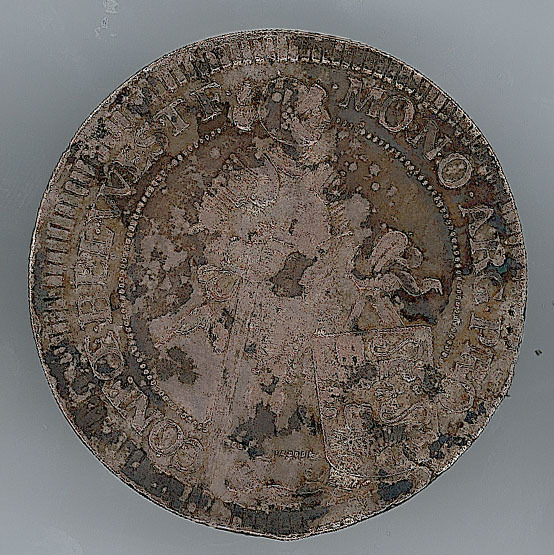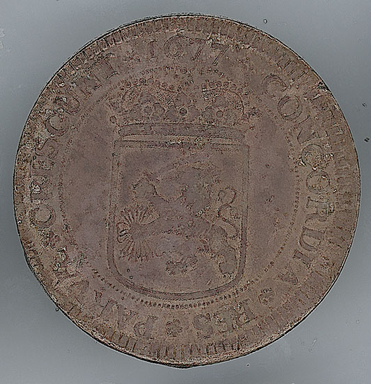Keerzijde: binnen een parelrand het gekroonde wapen van de Staten-Generaal, met een omschrift. Om het geheel een rand van langwerpige balkjes.