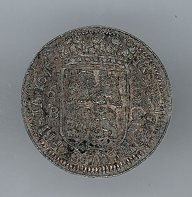 Keerzijde: het gekroonde wapen van West-Friesland geflankeerd door de waarde-aanduiding 6 - S en B - P, met een omschrift. Om het geheel een rand van langwerpige balkjes.