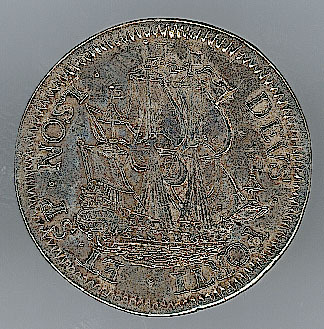 Voorzijde: een naar rechts varend zeilschip, met een omschrift. Om het geheel een rand van langwerpige balkjes.