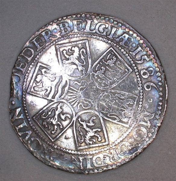 Keerzijde: Binnen een parelrand in cirkelvorm de wapens van de zeven verenigde provinciƫn, met in het midden een bundel van zeven pijlen. Omschrift: MO.ORDIN.PROVIN.FOEDER.BELGIAE.1586. Om het geheel een parelrand.