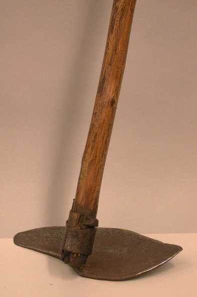 - BeschrijvingHalve maanvormig blad met middenachter de aanzet tot een steel. Deze eindigt in een gesmede huls. Hierin steekt een oude, ongelijkmatige steel die met spieën is vastgezet.