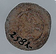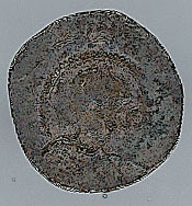 - BeschrijvingVoorzijde: Binnen een parelrand een bisschop ten halven lijve met mijter en kromstaf naar rechts. Omschrift onleesbaar, middenboven een kruisje (?). Keerzijde: Binnen een parelrand een gevoet kruis met stippen op de uiteinden. Omschrift onleesbaar.