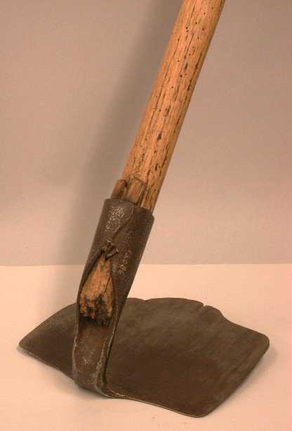 - BeschrijvingRechthoekig, plat blad dat in een hoek van ca. 70 graden in de huls staat. De steel is waarschijnlijk origineel en is d.m.v. spieën en nagels in de huls vastgezet.