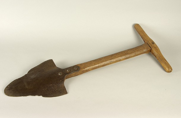 - BeschrijvingDriehoekig, plat blad met beschadigde zijden die d.m.v. twee slippen met elk drie nagels bevestigd is aan een hoekige steel met een gedraaide krukhandvat.