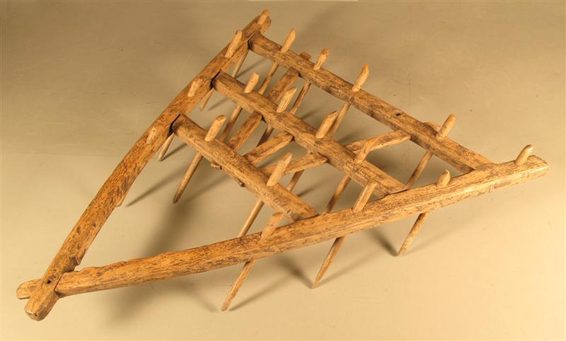 - BeschrijvingMooi exemplaar. Een typisch Zuid-Nederlands type waarvan het raamwerk aan de voorzijde iets is bewerkt. De eg heeft grote ronde pennen die erg schuin (ca. 60ยบ ) op het raamwerk staan met de spitse punten naar voren gericht.