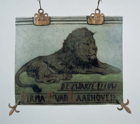 - BeschrijvingAan beide zijden voorstelling van liggende leeuw en opschrift: DE.ZWARTE.LEEUW./FIRMA. P. VAN LAARHOVEN Sporen van ouder opschrift nog vaag zichtbaar. Uitstekende hoekornamenten. Afkomstig uit Helvoirt, waar zich nog steeds een hotel-restaurant van die naam bevindt (1986).