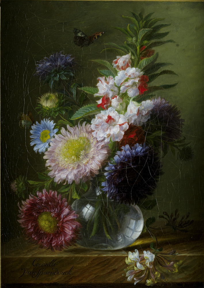 - BeschrijvingChinese asters en andere bloemen in een glazen vaas.