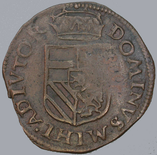 - BeschrijvingVz:gekroonde buste naar links, daaronder het jaartal 15 boompje 90; omschrift: .PHS.D.G.HISP.Z.REX.DVX.BRA. Kz:gekroond Oostenrijks-Bourgondische wapen; omschrift: DOMINVS.MIHI.A¬DIVTOR