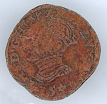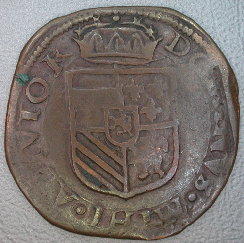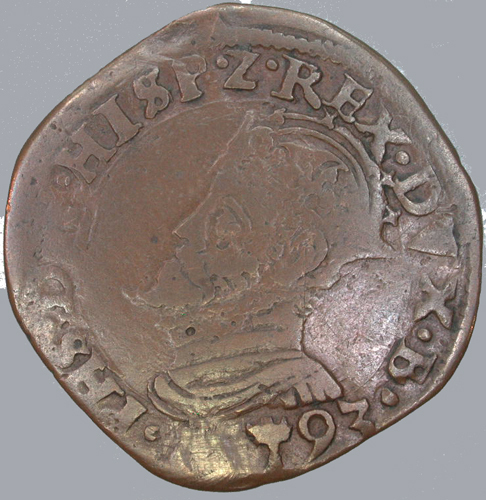- BeschrijvingVz:gekroonde buste naar links, daaronder het jaartal 15 boompje 93; omschrift: .PHS.D.G.HISP.Z.REX.DVX.BRA. Kz:gekroond Oostenrijks-Bourgondische wapen; omschrift: DOMINVS.MIHI.A¬DIVTOR