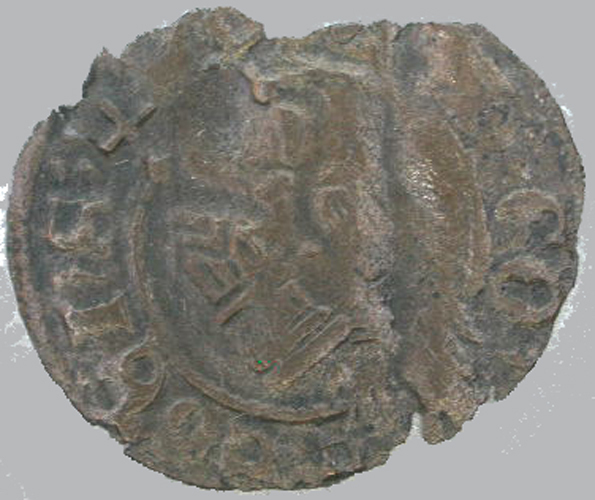 - BeschrijvingVz: een kasteeltje boven een adelaar, daarachter een parelrand. Kz: binnen een parelrand een gevoet kruis. Geslagen te Megen onder Jan III.